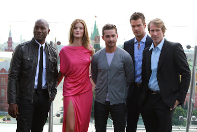 Rosie in a pink dress (notice something strange?) is at Ritz Carlton Hotel in Moscow for a photo call of all the actors from Transformers.